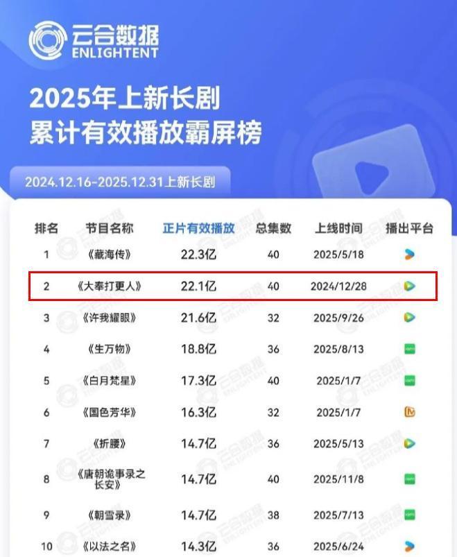 《大奉打更人》迎来大结局后,有很多网友都在“嘲笑”王鹤棣,毕竟《大奉打更人》取得的成绩不理想,但这部剧真的没有取得亮眼的成绩吗?近日,官方发出2025年上新长剧累积有效播放霸屏榜,共有20部电视剧入选。